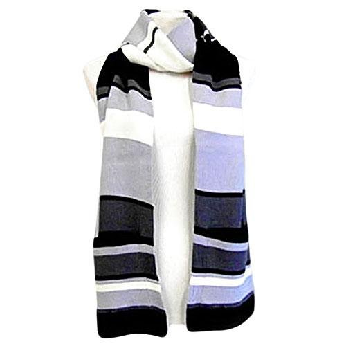 Extra long and scrumptious, this scarf is made in a traditional ribbed knit style. Some of the colors in this scarf include brown, beige, blue and black.